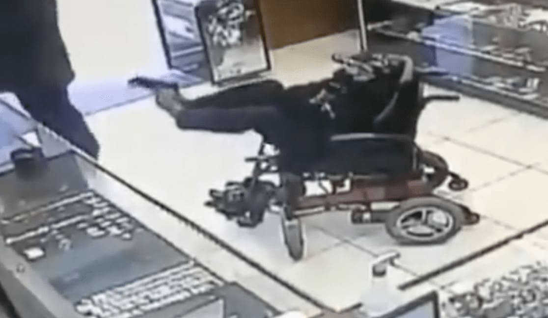 Un hombre sin extremidades superiores, fue grabado mientras atracaba la joyería mientras sostenía la pistola con sus propios pies. En las imágenes se muestran cómo dependiente y el resto de clientes pasan desapercibidos ante tal hecho, incluso no tomándolo muy en serio.