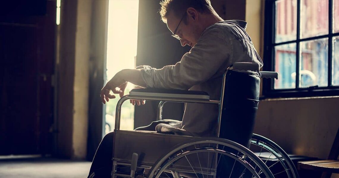 Joven cabizbajo en una silla de ruedas.