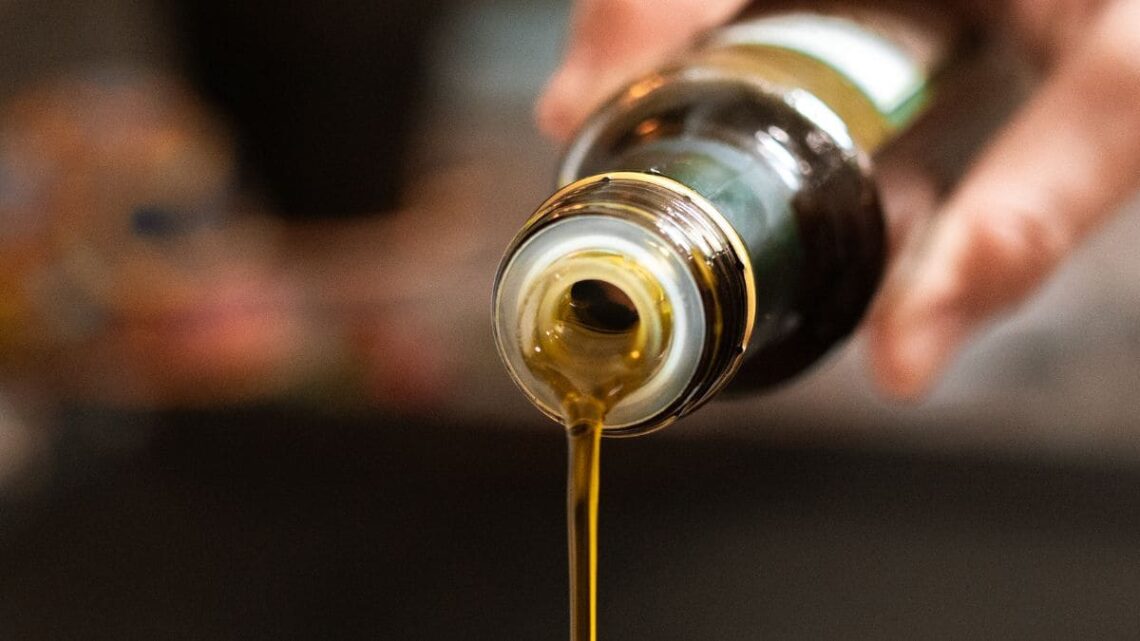 Persona utilizando una botella de aceite de oliva