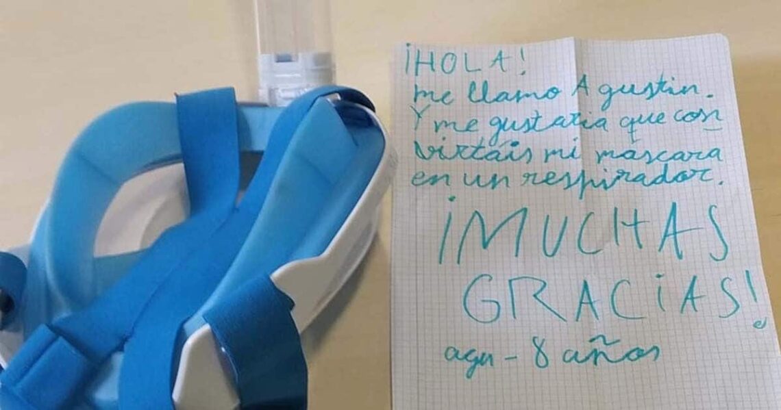 Junto a la máscara, el pequeño ha aportado una carta que decía lo siguiente: «Hola. Me llamo Agustín y me gustaría que convirtáis mi máscara en un respirador. Muchas gracias».